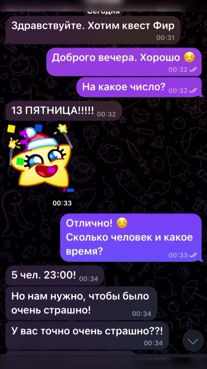 Перфоманс. С актерами. Страшный. По 10 б.шкале: Логика: 3-5 Страх: 4-7 Контакт: 3-7 Кол-во выходов актеров: 8-10 Юмор: 3-6